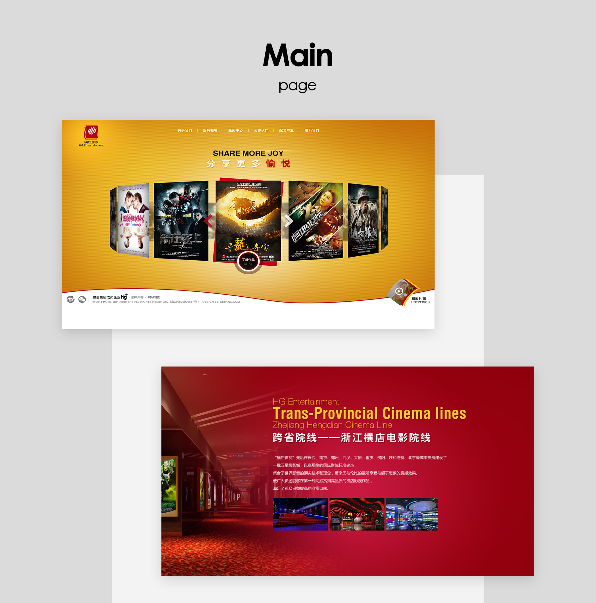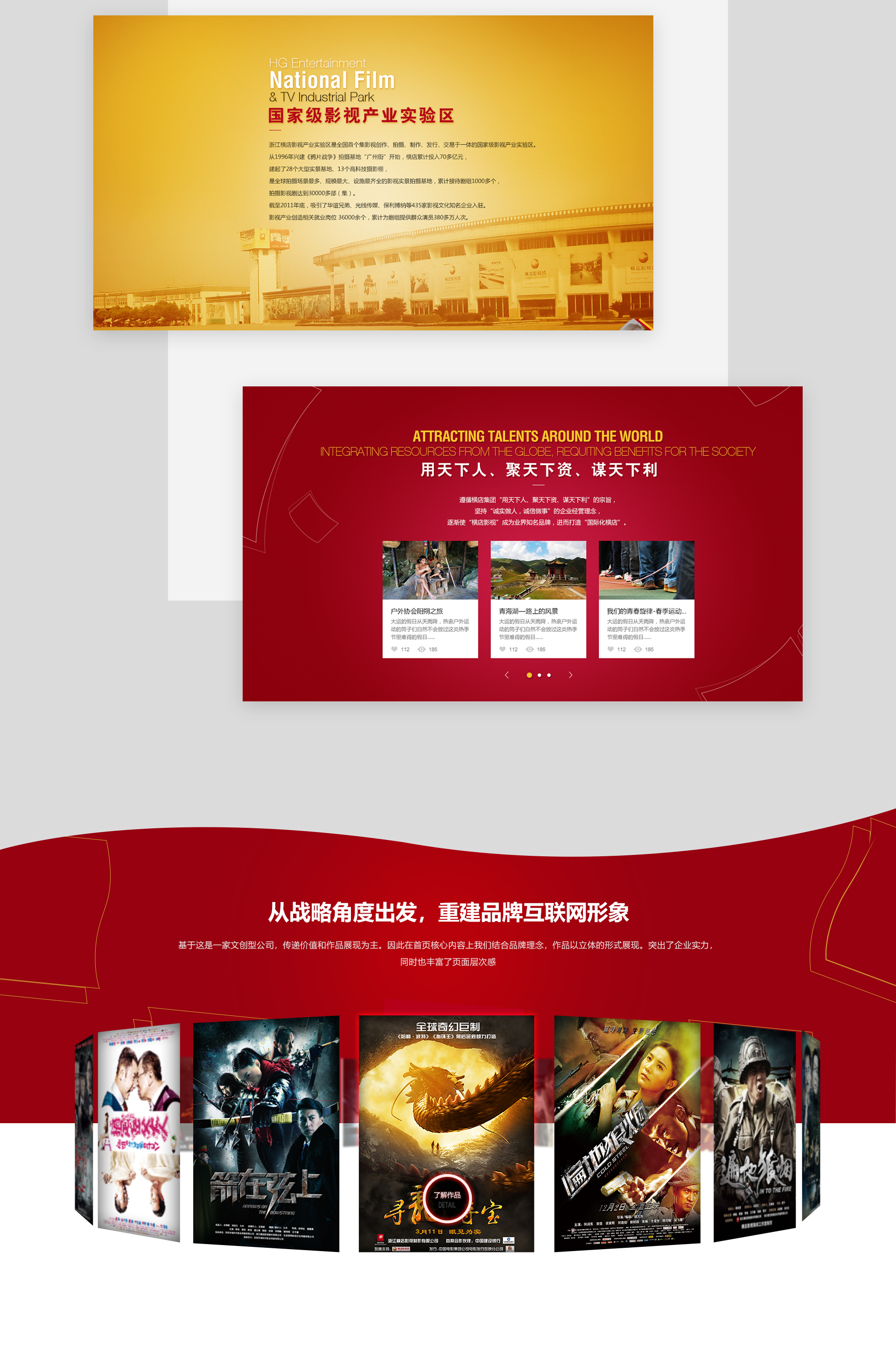 横店是全球最大的影视实景拍摄基地,拥有秦王宫、清明上河图、广州街·香港街、明清宫苑、梦幻谷、明清民居博览城、华夏文化园等28个实景基地和10座高科技摄影棚,被美国《好莱坞报到》杂志称为“中国好莱坞”。区别于常规的网站改版,该项目具有高度的战略意义——践行横店影视的全球化发展战略。因此,我们基于品牌的这一战略高度来定制打造了横店官网。